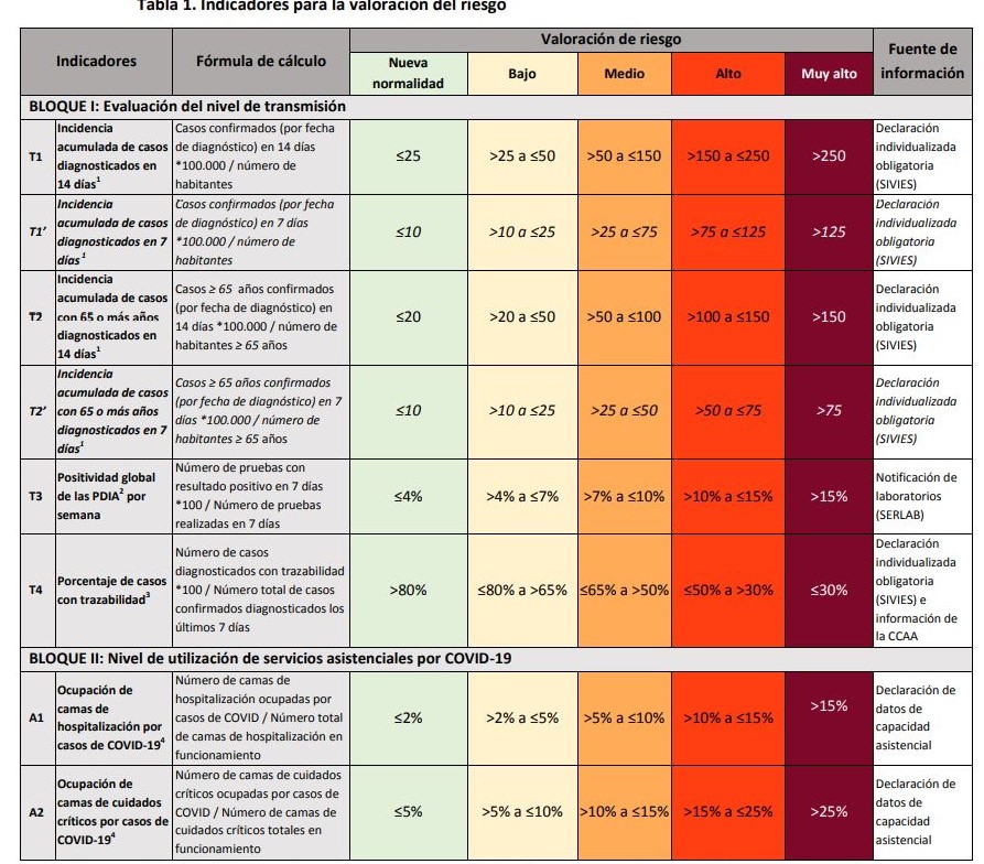 * Nivel de alerta 2 (transmisión comunitaria sostenida generalizada con presión creciente sobre el sistema sanitario): cuando al menos dos indicadores del bloque I y uno del bloque II están en nivel medio.