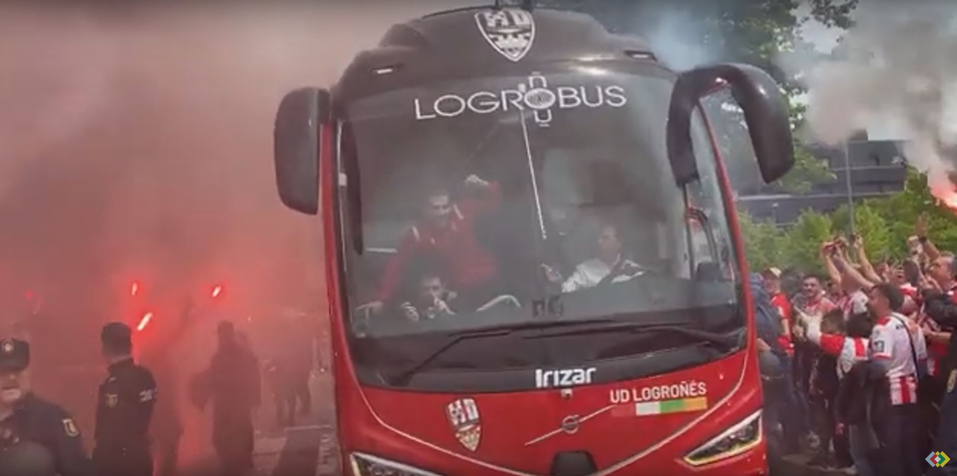 16:15 y los jugadores llegan a Las Gaunas. A las puertas, un muy nutrido grupo de aficionados se congregaban para alentar a los suyos antes de saltar al campo en un encuentro que después se vestiría de épico.