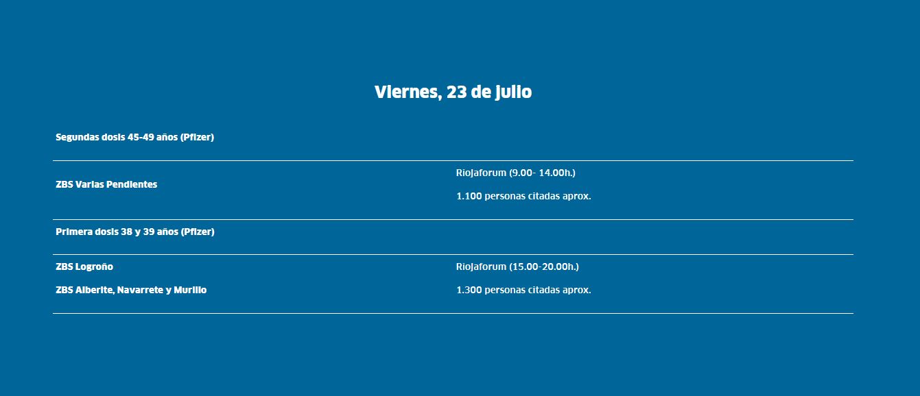 Además, durante esta semana está previsto comenzar la vacunación de los menores de 30 años en Rioja Alta. Este grupo etario se estrenará en la vacunación y lo hará con Pfizer, el jueves por la tarde en el Pabellón Multiusos de Nájera (15.00-20.00h.) junto a los riojalteños de 32 a 30 años.