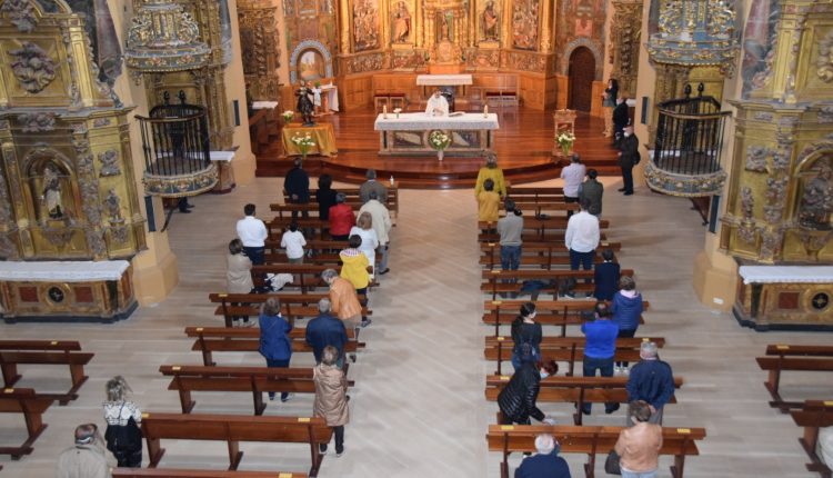 A la entrada, unas mascarillas, por si alguno de los asistentes no tenía, daban la bienvenida a todos aquellos que se acercaban al templo. En los bancos, unos carteles recordaban la necesidad de mantener la distancia de seguridad y en la parte delantera de la zona de bancos, dos dispensadores de hidrogel, especialmente pensados para el momento de la comunión.