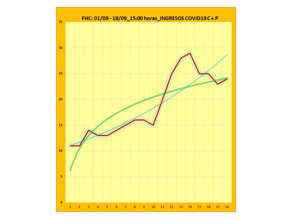 En la GRÁFICA se muestra (color rojo) la evolución de los ingresos COVID-19 en FHC desde el 1 hasta el 18 de septiembre,