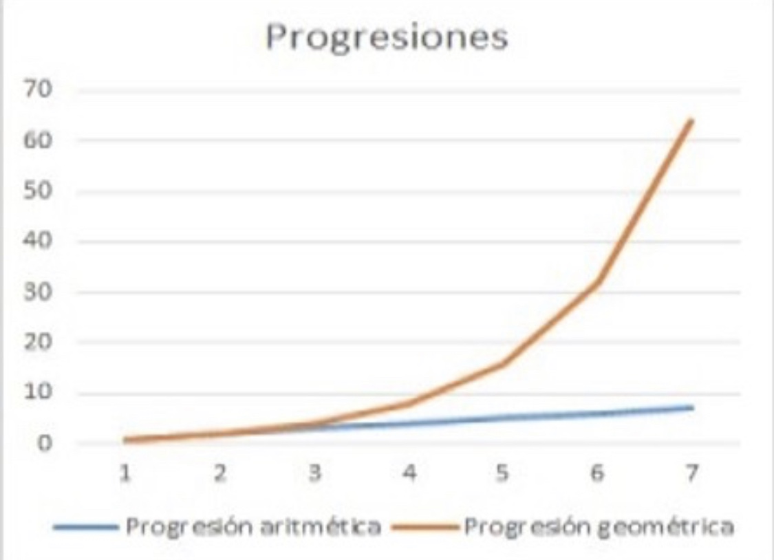 Simplificando mucho la cosa, una progresión tradicional, técnicamente se llama progresión aritmética, es 1,2,3,4… o 2,4,6,8…, es decir, vamos sumando una cantidad fija al número anterior y no valen para las epidemias, ya que cada persona contagiada, se convierte a su vez en contagiador. Es decir si tenemos dos contagiados y cada uno contagia a otros dos tendremos cuatro y cada uno contagiará a dos y tendremos ocho. Es decir nos tenemos que olvidar de la suma y utilizar la multiplicación, multiplicando por una cifra fija la cantidad anterior. Es decir 1,2,4,8… En este gráfico se aprecia la diferencia en las velocidades de subida de una y otra progresión y es que las puñeteras de las geométricas una vez que cogen un poco de cuerpo se disparan. ¿A qué la linea naranja se parece a la curva de casos que hemos estado viendo en la tele?