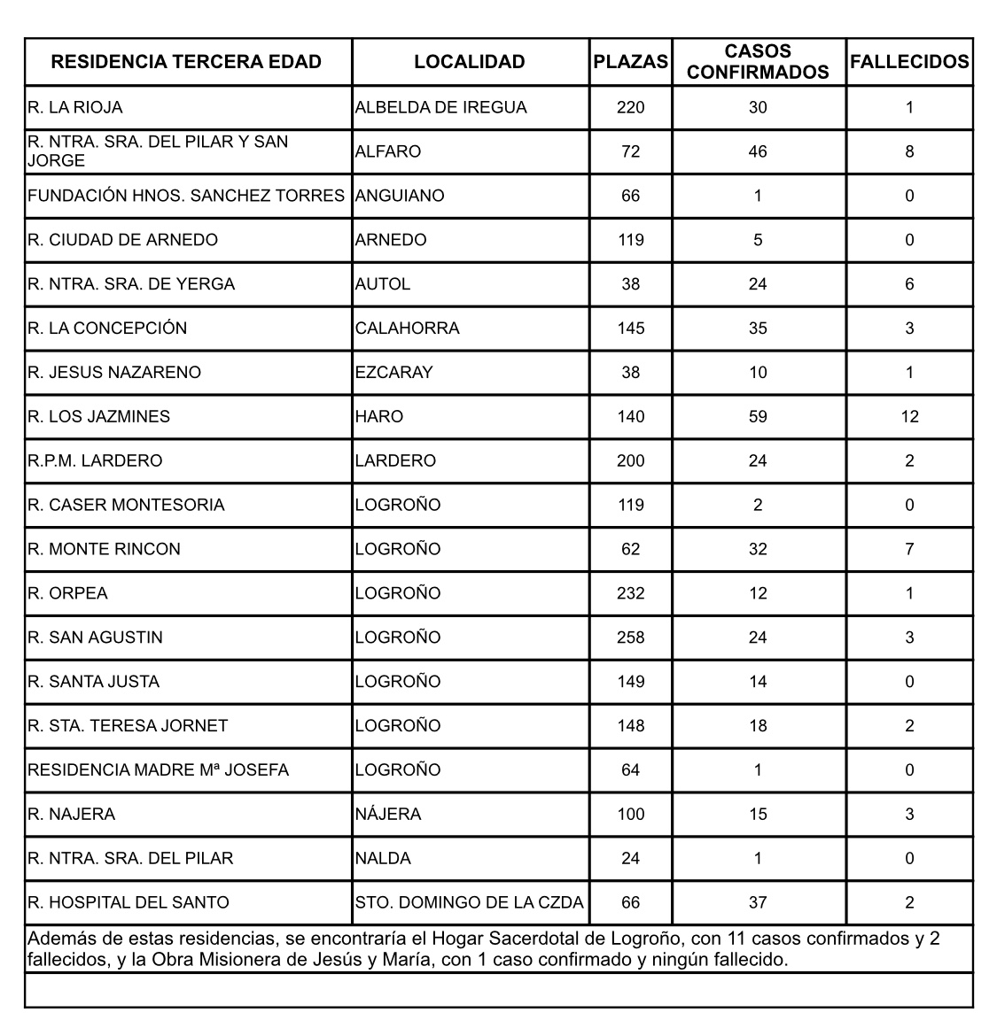 En las residencias de la tercera edad de la Rioja, existen actualmente 402 casos confirmados en 21 residencias, mientras que trece centros no presentan ningún caso. Los centros con mayor número de casos confirmados en la actualidad son Los Jazmines de Haro con 59, la Residencia Nuestra Señora del Pilar y San Jorge de Alfaro con 46 y el Hospital del Santo de Santo Domingo de la Calzada con 37.