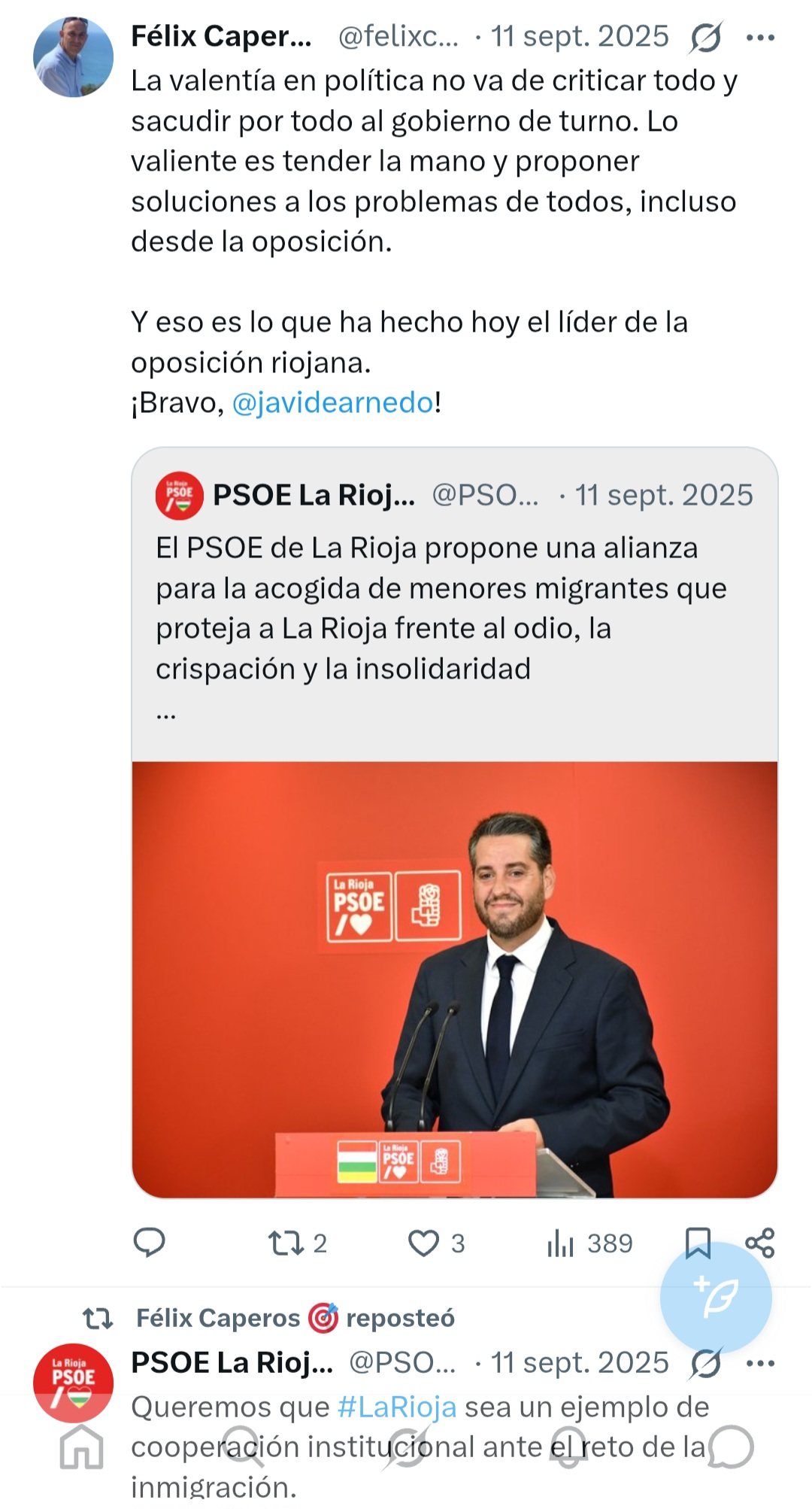 Si no fuera, porque el propio Caperos en un tuit del 11 de septiembre de 2025, escribía «La valentía política no va de criticar todo sacudir por todo al gobierno de turno. Lo valiente es tender la mano y proponer soluciones a los problemas de todos, incluso desde la oposición», ahí es nada,curiosamente, ensalzando la propuesta de «alianza» en la acogida de menores de García. Si no fuera por todo esto, quizá podría tener su gracia o ser, directamente, una estrategia cuestionable. Pero, además, es triste.