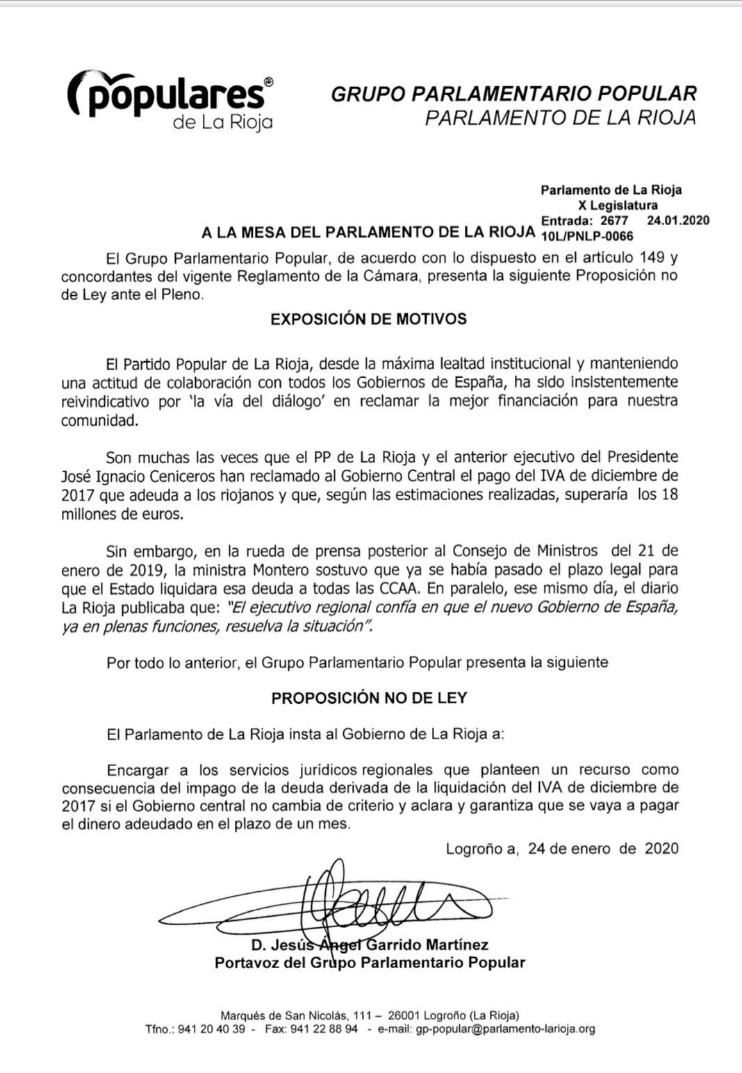 Alfonso Domínguez ha realizado estas declaraciones hoy, día 18,durante una rueda de prensa en la que ha presentado una Proposición No de Ley del Grupo Popular que se debatirá en el Pleno del Parlamento de La Rioja del próximo jueves y que exige al Gobierno Regional “a encargar a los servicios jurídicos regionales que planteen un recurso como consecuencia del impago de la deuda derivada de la liquidación del IVA de diciembre de 2017 si el Gobierno Central no cambia de criterio, aclara y garantiza que se vaya a pagar el dinero adeudado en el plazo de un mes”.
