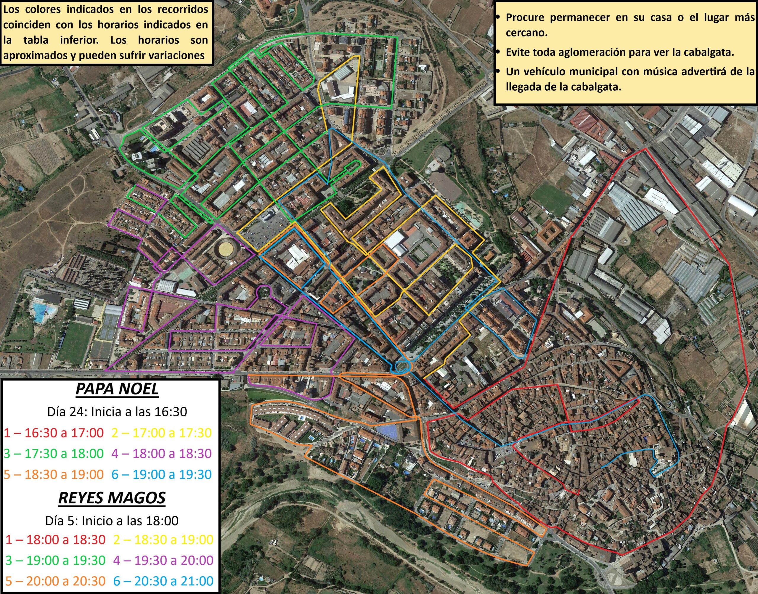 El recorrido de Papá Noel y los Reyes Magos, de cerca de 30 km, será el mismo. Cada color del mapa que puede descargarse desde aquí se corresponde con, aproximadamente, 30 minutos de recorrido durante las horas indicadas en la leyenda del mapa.