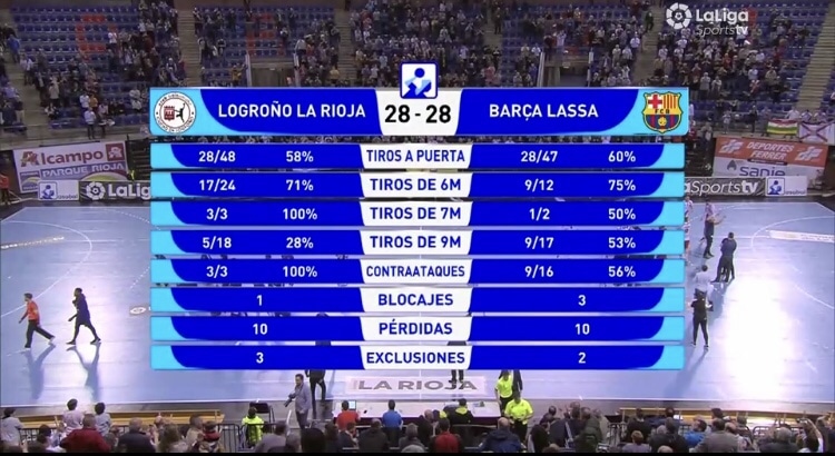 Con 28-28 tuvo la última el Barça Lassa; pero logró acabar la jugada preparada en el tiempo muerto. Balón para los riojanos y cinco segundos por delante. Tiempo muerto, falta, susto con la cabeza de Balenciaga rebotando sobre el parqué. Lanzamiento directo de falta y fin.
