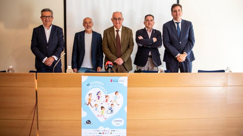 El consejero de Educación, Cultura, Deporte y Juventud, Pedro Uruñuela, y el director general de Deporte, Eloy Madorrán, han presentado esta mañana la VI edición de la Carrera de la Familia en compañía de José Luis Roca, presidente de la asociación Corre que te Pillo, promotora de la prueba; y de Javier Galiana, director ejecutivo de UNIR, institución colaboradora. Esta carrera de carácter solidario se celebrará el próximo día 22 a partir de las 11:00 horas en Logroño, y sus beneficios irán destinados a los niños y niñas ucranianos, a través de la ONG Save the Children.
