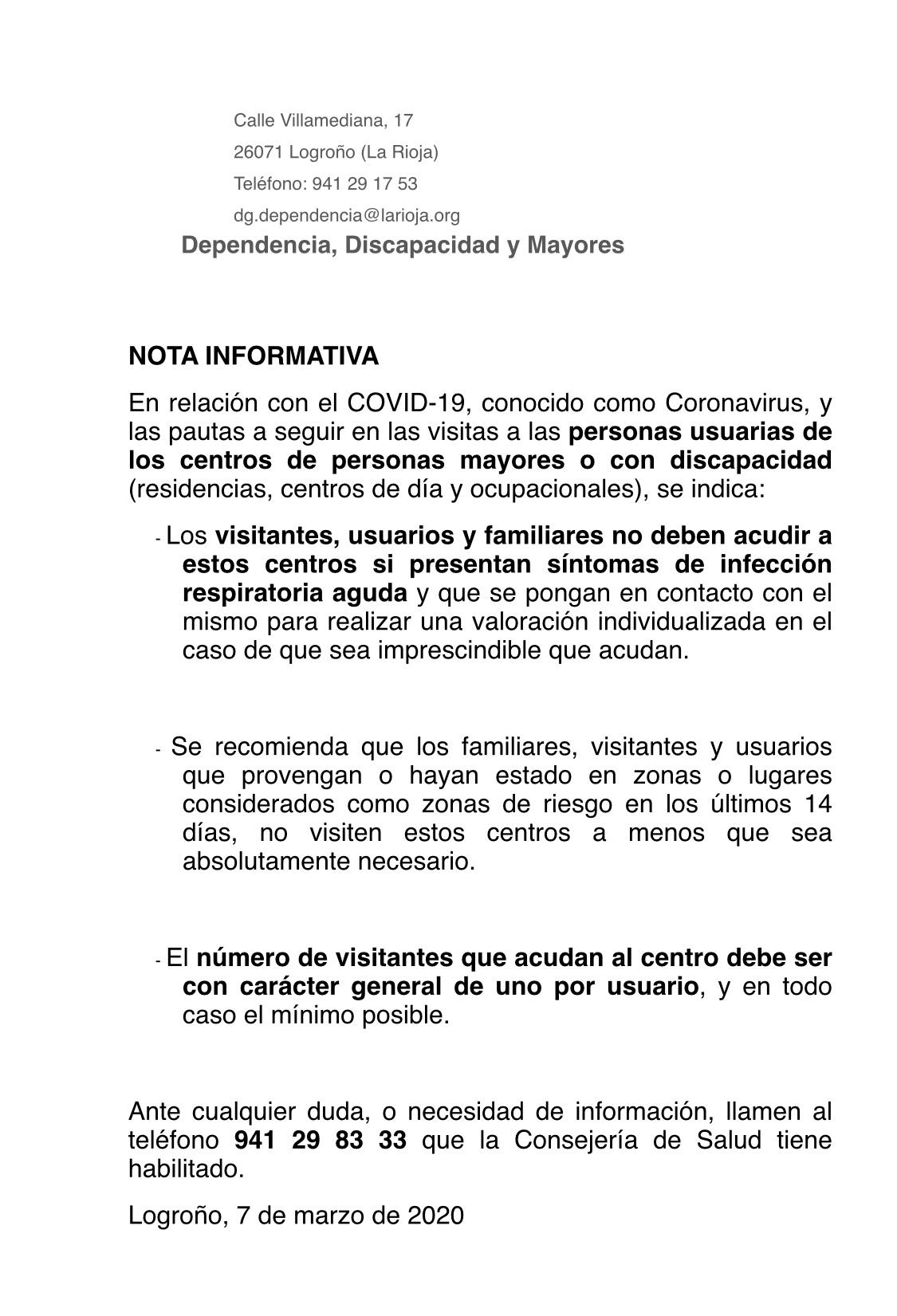 El Gobierno de La Rioja, a través de la Consejería de Servicios Sociales y a la Ciudadanía, en coordinación con la Consejería de Salud, ha remitido una serie de recomendaciones a los centros socio sanitarios (incluidos los centros de día residencias y centros ocupacionales de personas con discapacidad) y residencias de mayores, recomendaciones que siguen las directrices del Ministerio de Sanidad para prevenir el COVID-19.
