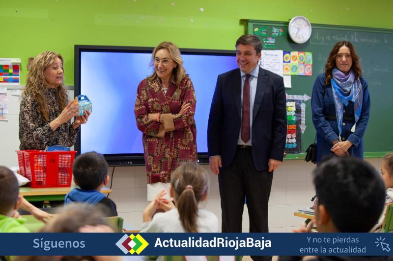 La consejera de Salud y Políticas Sociales, María Martín, y el consejero de Educación y Empleo, Alberto Galiana, han repartido hoy los estuches entre el alumnado de 1º a 6º de Educación Primaria del CEIP Eduardo González Gallarza de Lardero