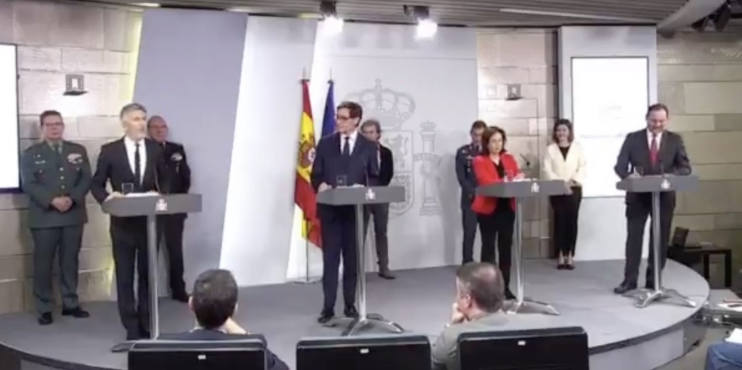 El ministro del Interior, Grande-Marlaska, ha presentado una orden por la que establece los criterios comunes de actuación para todas las Fuerzas y Cuerpos de Seguridad, que deberán actuar de forma coordinada bajo el mando del Ministerio del Interior con el objetivo de hacer cumplir medidas tales como el control de los movimientos, el apoyo a las labores sanitarias, garantizar el suministro alimentario y de bienes de primera necesidad o asegurar el funcionamiento de las infraestructuras críticas.