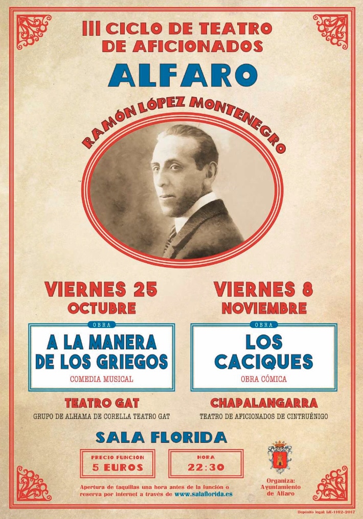 Alfaro acogerá, los días 25 de octubre y 8 de noviembre, el III ciclo de teatro de aficionados «Ramón López Montenegro» en la sala Florida. El coste de la entrada será de 5 euros y podrán adquirirse, previamente a través de internet www.salaflorida.es o el mismo día de la representación en las taquillas desde una hora antes del inicio de la función.