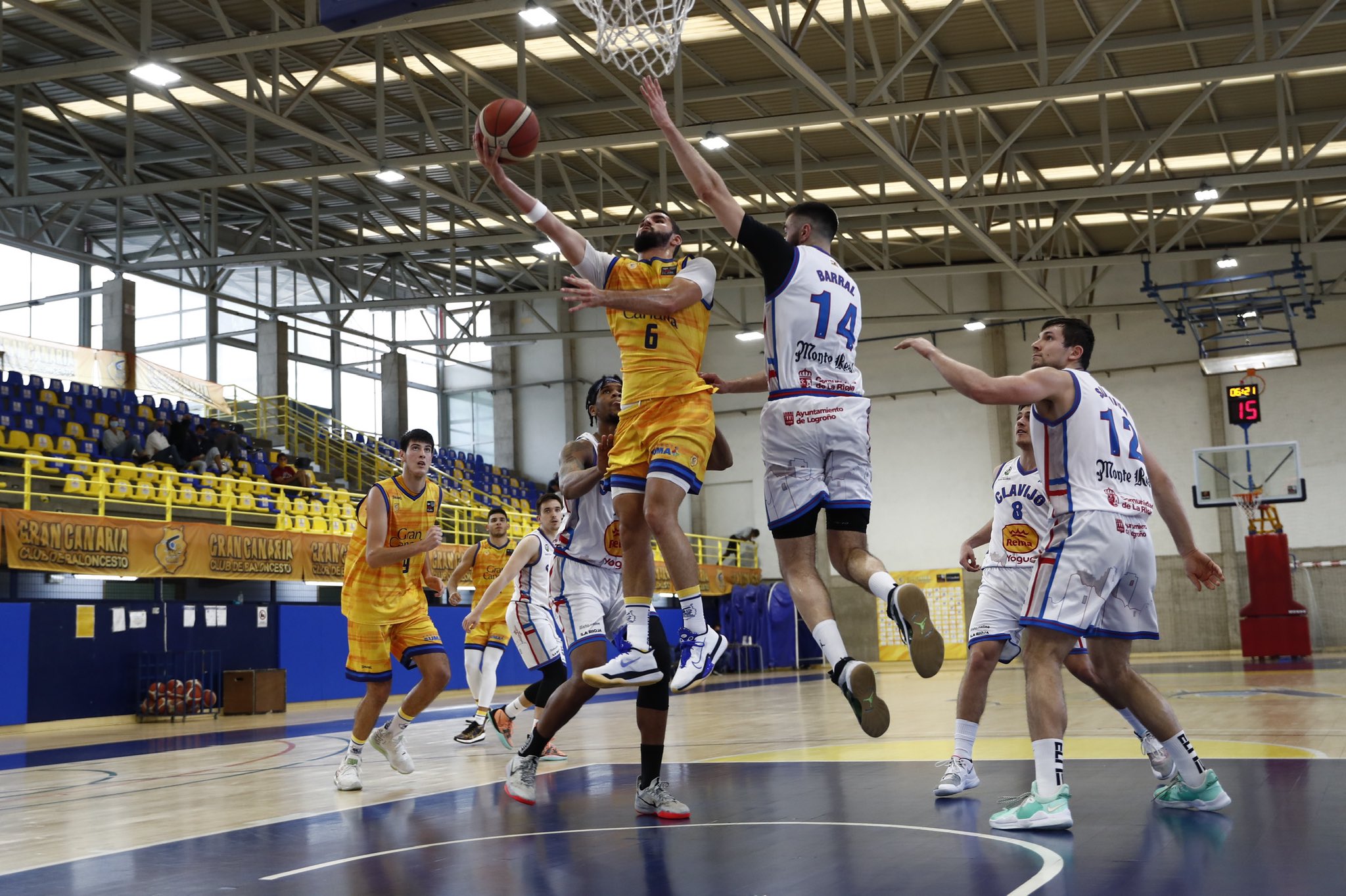 En la recta final del choque, con la victoria amarilla ya decidida, la intriga estaba en conocer cuál sería la distancia que los riojanos deben remontar la próxima semana en el Palacio de los Deportes si quieren pasar de ronda. Gerardo Pérez, con ocho puntos consecutivos, se aseguraba de que estuviese más cercana de la veintena que de la decena para, al finalmente, terminar el duelo con dieciocho puntos (98-76) de renta.