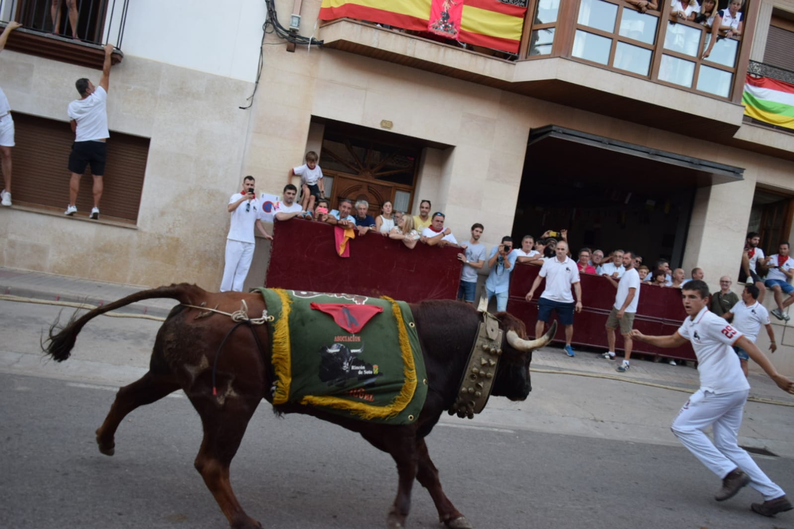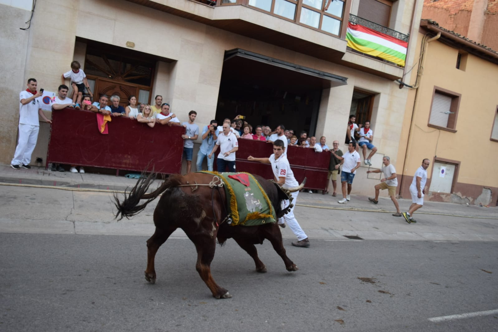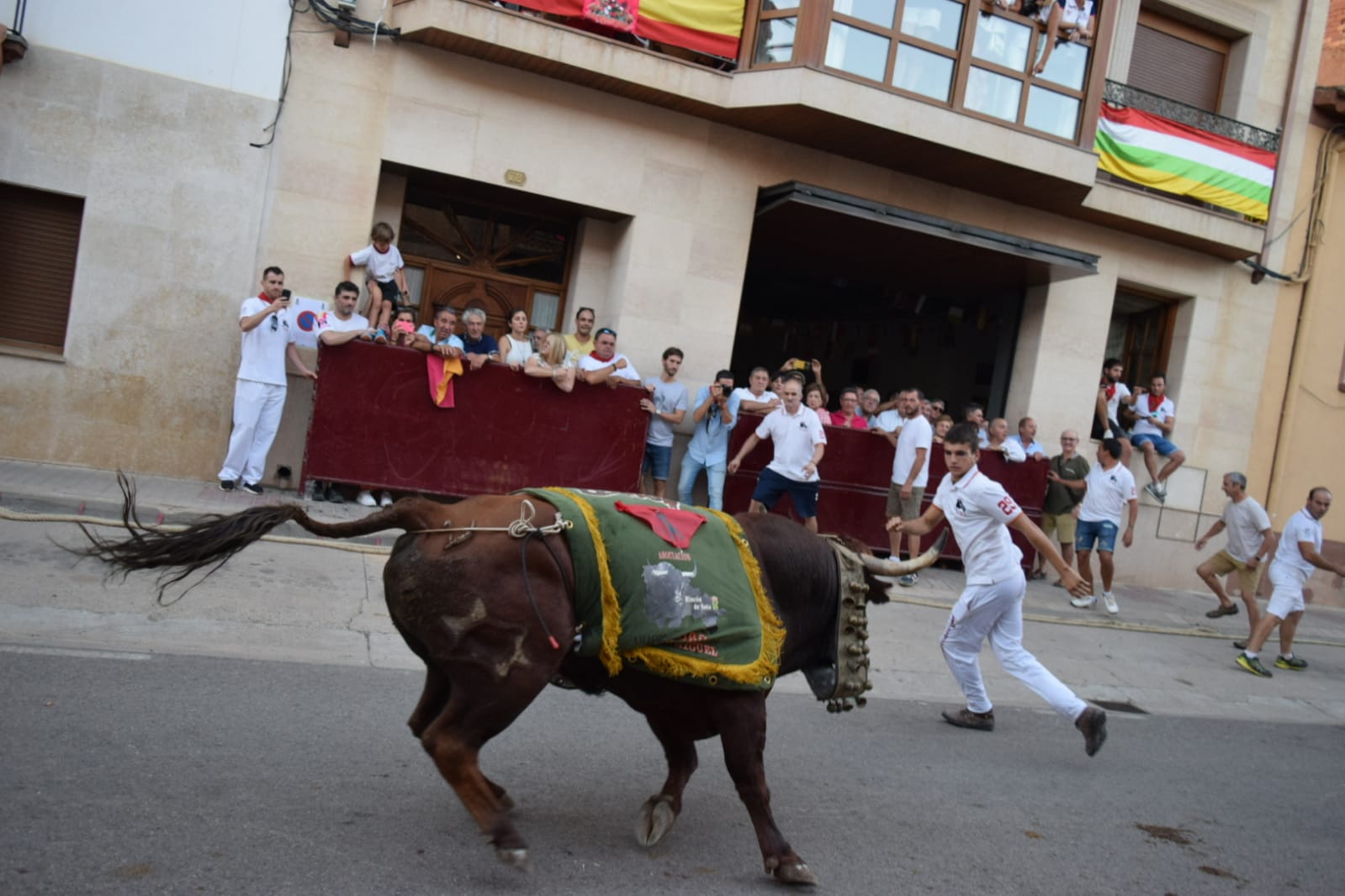 De nuevo, un grupo de valientes han vuelto a colocar el tradicional mantón a un imponente astado, bien presentado. que después ha paseado, adornado con él, por el recorrido del encierro.