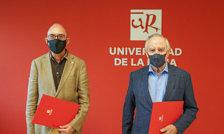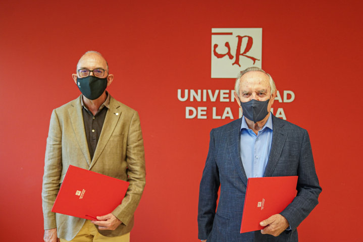 Juan Carlos Ayala, rector de la Universidad de la Rioja, y Pedro Garnica, presidente de Garnica Plywood S.A., han renovado este miércoles 28 de julio el convenio de colaboración entre ambas entidades, que permite financiar el principal programa de promoción del talento y del esfuerzo académico de la Universidad de La Rioja.