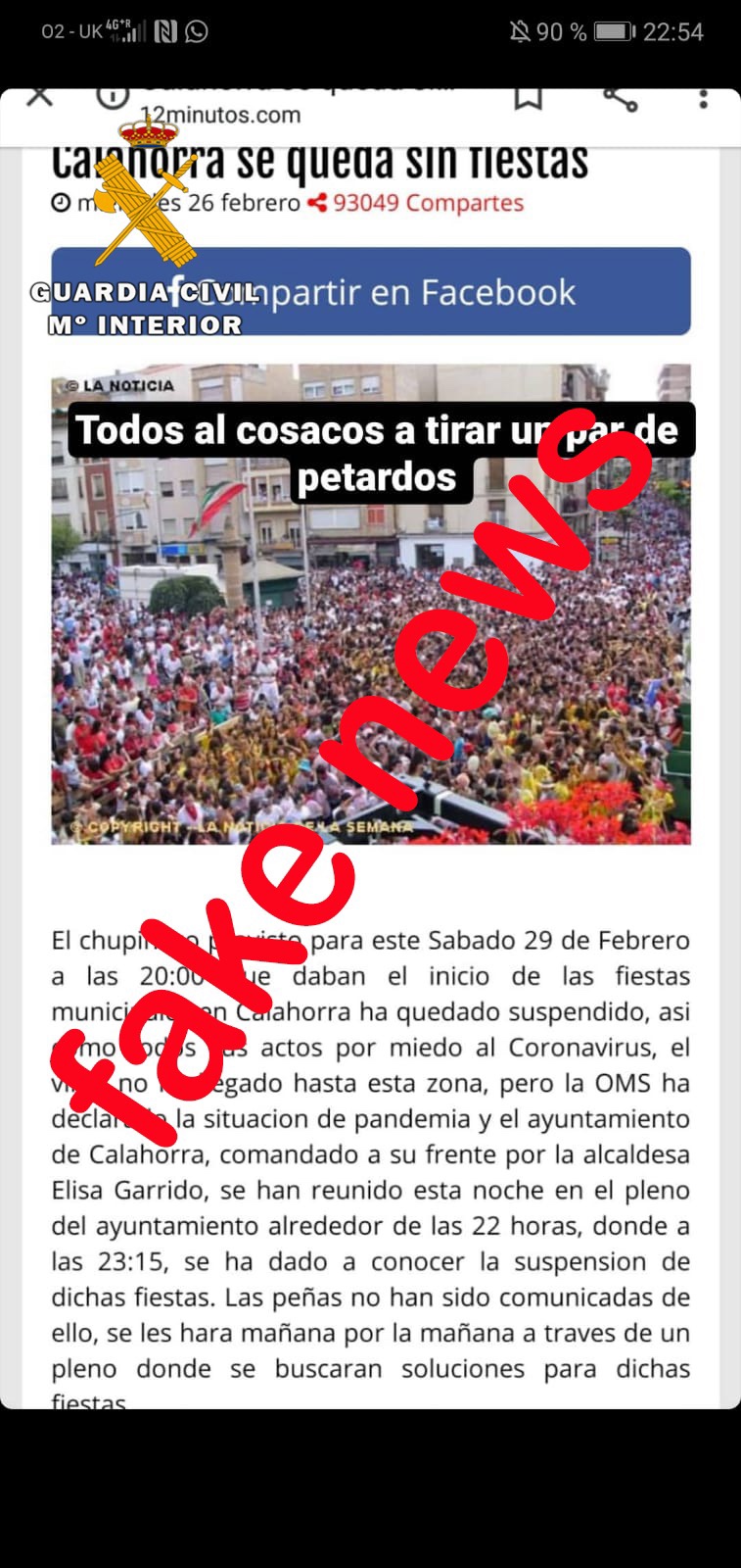 El pasado día 27 de febrero el Ayuntamiento de Calahorra interpuso “denuncia escrita” ante la Guardia Civil, tras haber tenido conocimiento de la difusión de una noticia falsa en la que se quería hacer creer a los ciudadanos que, mediante un pleno, el citado Ayuntamiento había suspendido el chupinazo previsto para el sábado 29 de febrero a las 20:00.