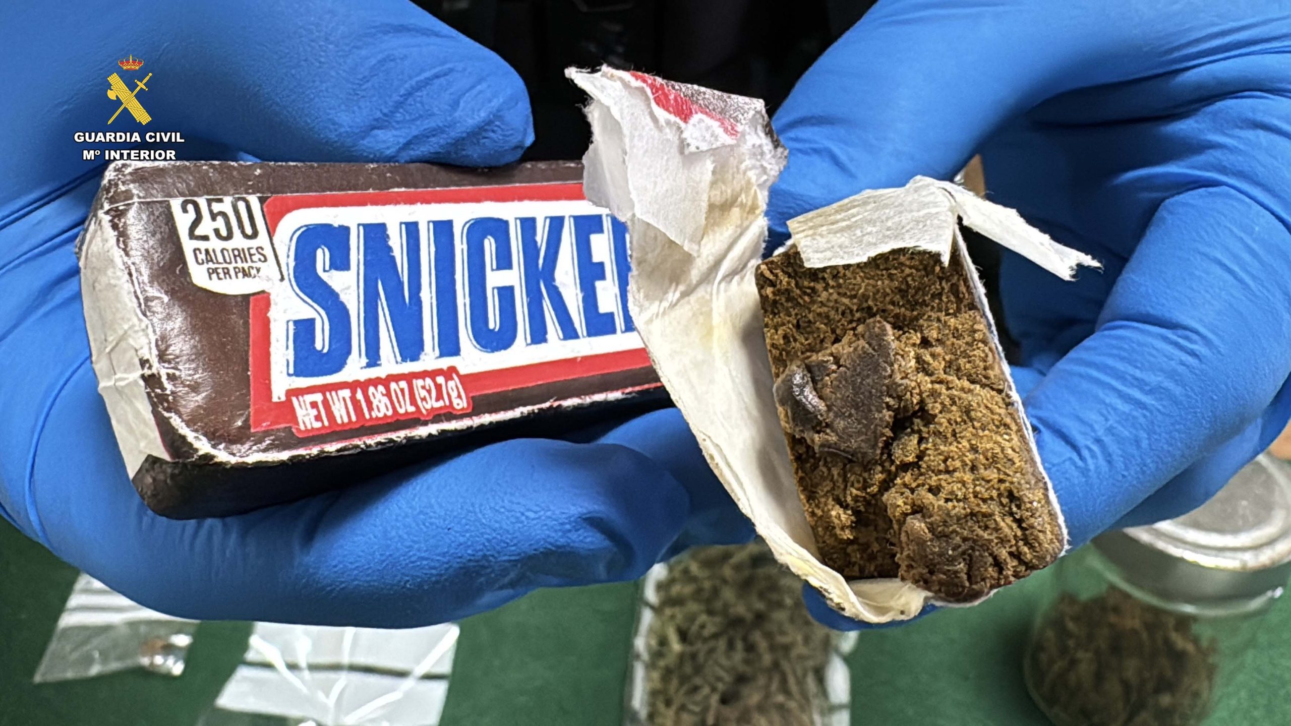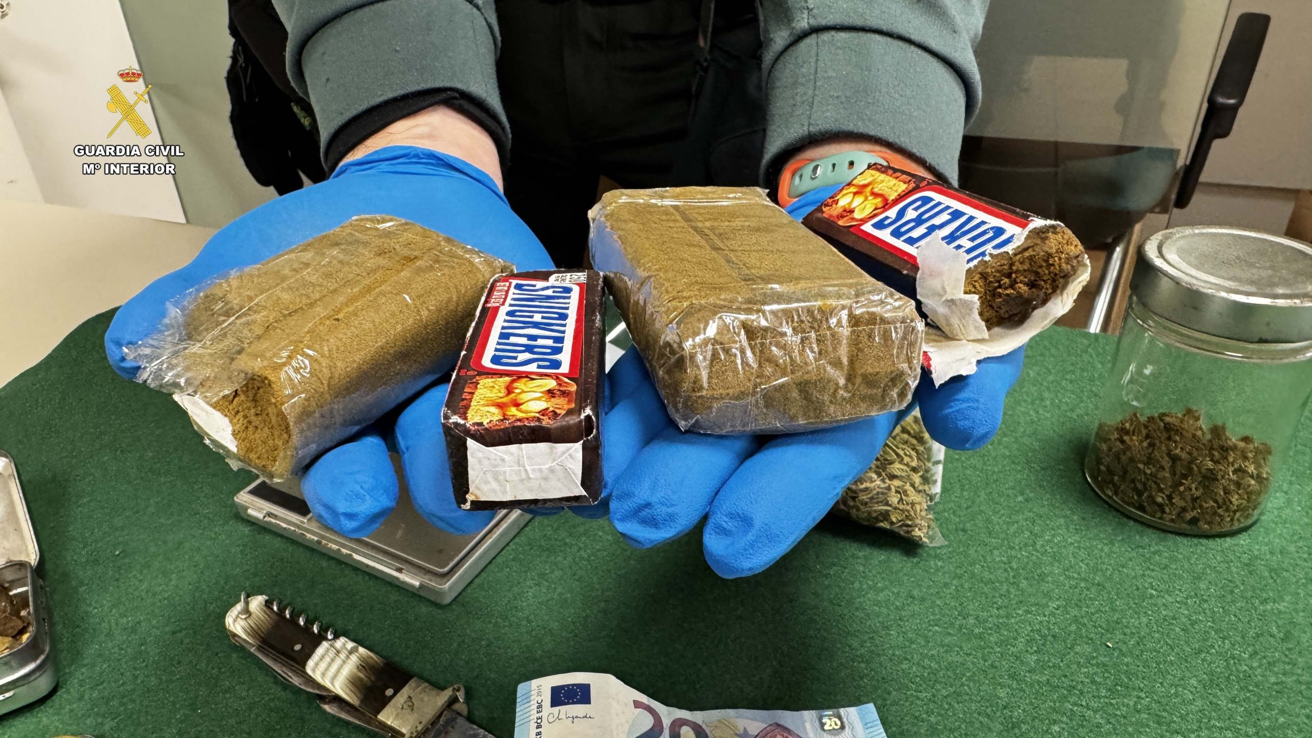 En el posterior registro de su vivienda, autorizado de forma voluntaria, se intervinieron 285 gramos de hachís —parte de él camuflado en envoltorios de chocolatinas—, 20 gramos de marihuana, una báscula de precisión, dos navajas con restos de droga y 120 euros en moneda fraccionada.