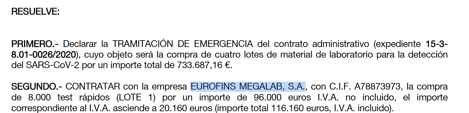 El contrato riojano habría sido suscrito en abril de 2020, exactamente el día 15 de abril, bajo el expediente 15-3-8.01-0026/2020. La Rioja adquirió 8.000 test rápidos por un importe de 116.160,00 € (alrededor de 14,52 euros la unidad). La adquisición la llevó a cabo el Servicio Riojano de Salud.