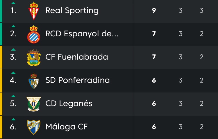En la zona noble de la tabla manda con puño de hierro un imbatido Sporting de Gijón con nueve puntos. Tres de ellos sumados ante la UD Logroñés gracias a un gol de Djuka (pichichi de la categoría) en los minutos finales. Por detrás de los de David Gallego se encuentran; Espanyol en puesto de ascenso directo y Fuenlabrada, Ponferradina, Leganés y Malaga en zona de acceso a playoffs de ascenso a La Liga Santander.