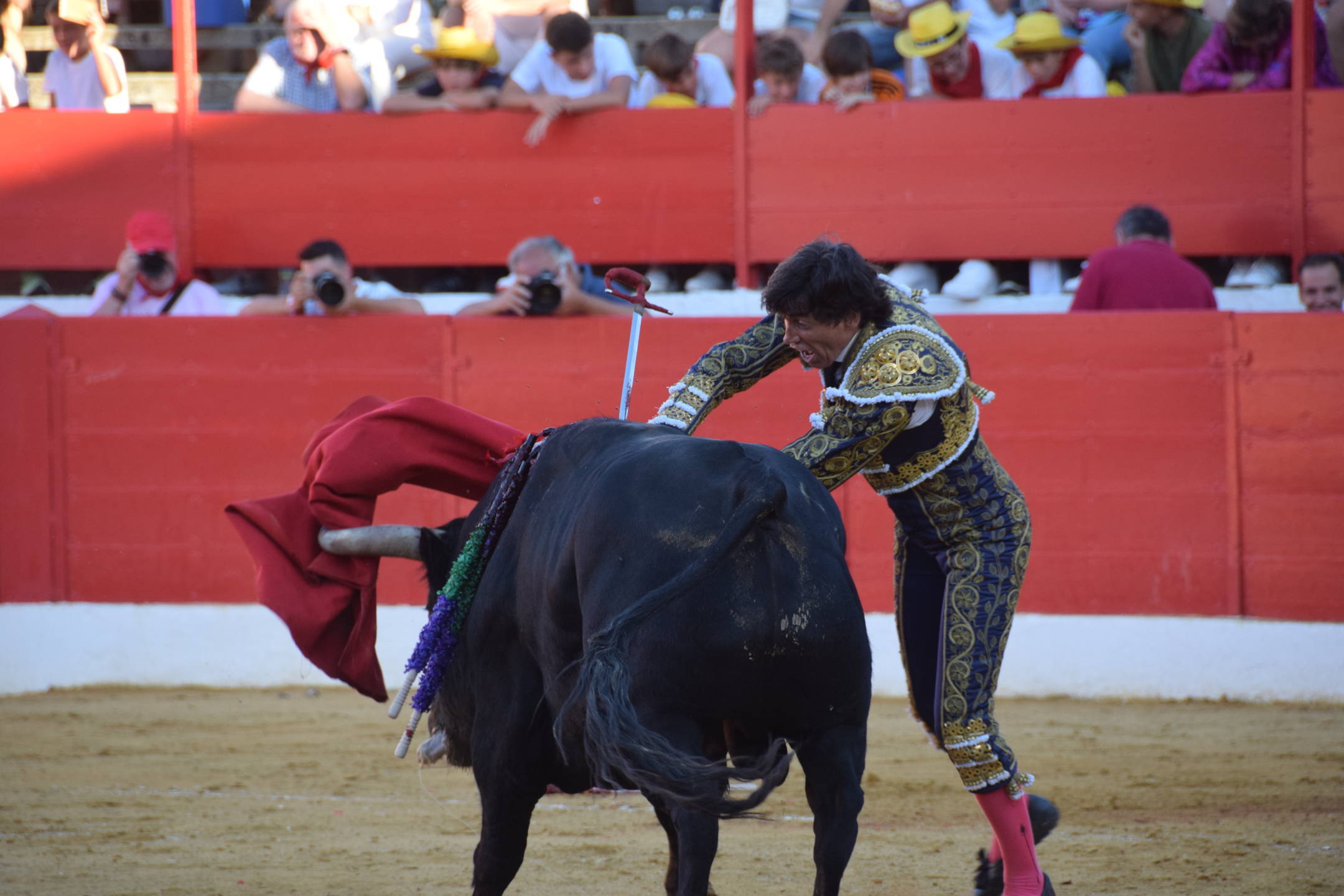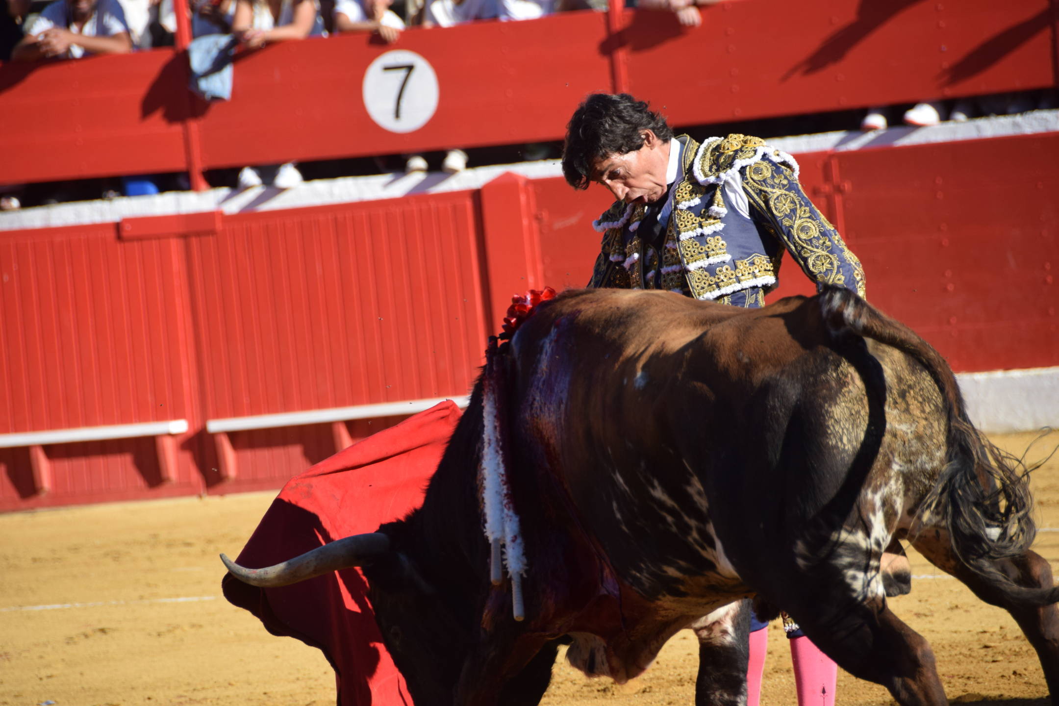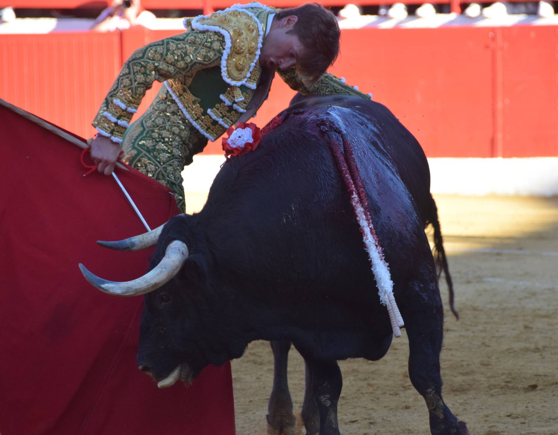 Juan Leal, el triunfador de la tarde, dereorojó al segundo de la tarde gracias a una espectacular estocada en la que se montó sobre el toro tras una faena que fue de menos a más, aunque posiblemente llegando a demasiado.
