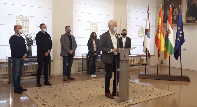 Pablo Hermoso de Mendoza, acompañado por los portavoces municipales Iván Reinares (Partido Socialista), Conrado Escobar (Partido Popular), Ignacio Tricio (Ciudadanos), Amaia Castro (Unidas Podemos) y Rubén Antoñanzas (Partido Riojano), ha mantenido un encuentro informativo con los medios de comunicación para transmitir la “unidad” de los grupos políticos con representación en el Ayuntamiento de Logroño y “condenar de forma rotunda” los actos de violencia que tuvieron lugar ayer por la noche en la capital de La Rioja.