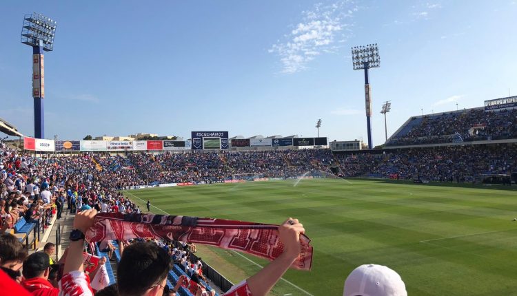 El Rico Perez nos esperaba con sol, ambiente hostil, puro partido de play off. Los nuestros en aquella esquina, sin camiseta, con banderas de la Rioja, todos con colores blancos y rojos.