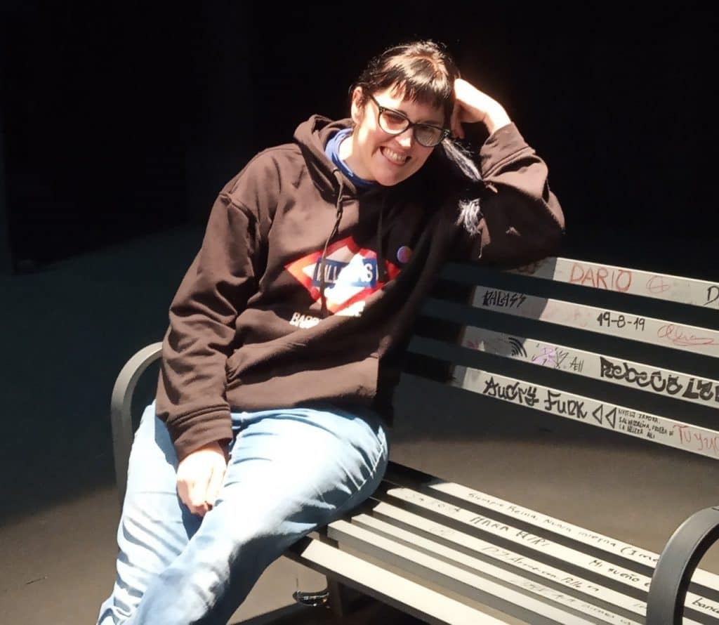 Decidimos sentarnos en el banco que emplea como único atrezo de su obra, iluminado según lo requiera la escena a representar. A lo lejos, colgada en una percha en un lateral del escenario nos mira una sudadera con capucha. La sudadera que transforma a Pamela en Antonio, su novio de los 12 a los 18 años cuya relación que es el origen de este monólogo llevado a su máxima expresión en esta última versión; y también el origen de su infierno. Un monólogo de casi dos horas de una sola persona transmitiendo energía a cada movimiento e interpretando personajes totalmente contrapuestos con un simple giro de cara.