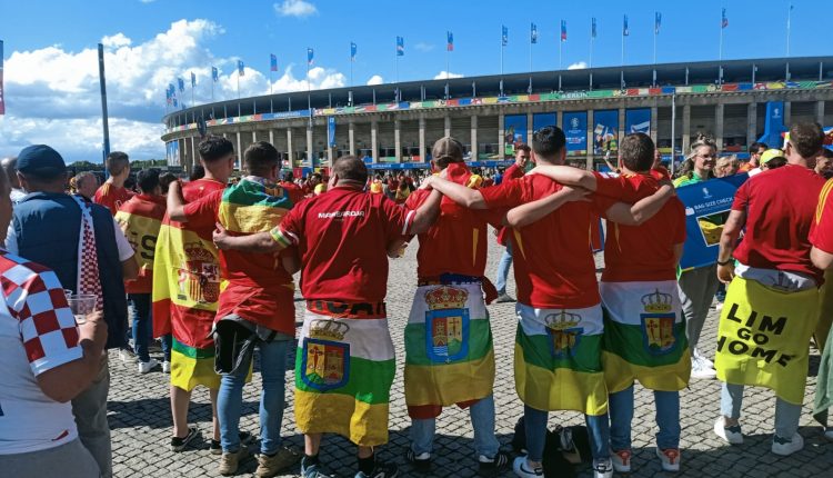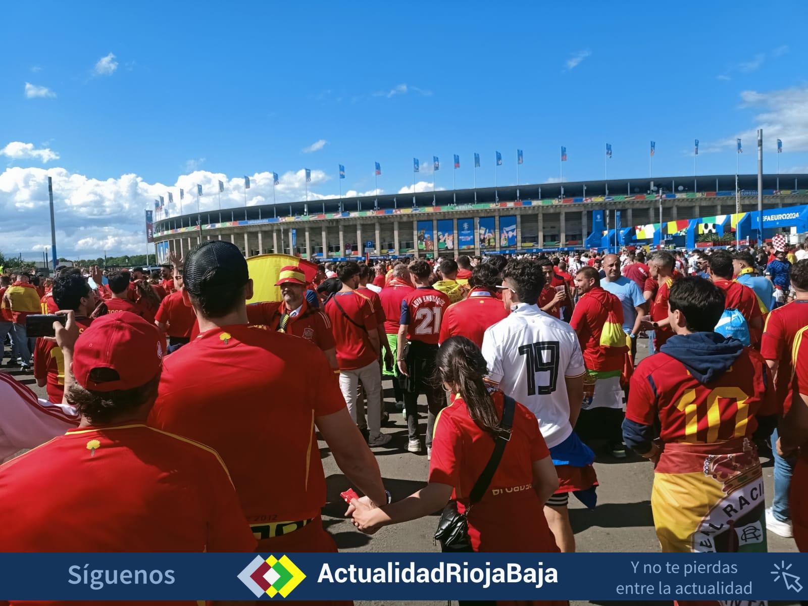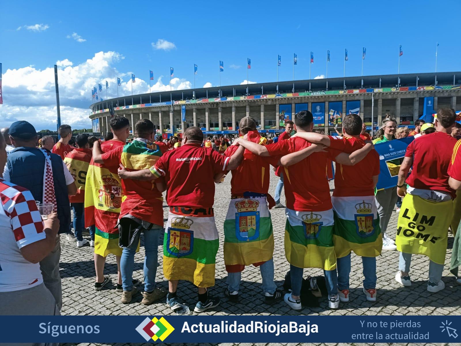 Los españoles, entre ellos varios riojanos, llevan dando todo el día color y calor a las calles de Berlín. Ahora, cuando queda algo más de hora y media para que comience el encuentro, los españoles ya se encuentran en las proximidades del Olympiastadion Berlín.