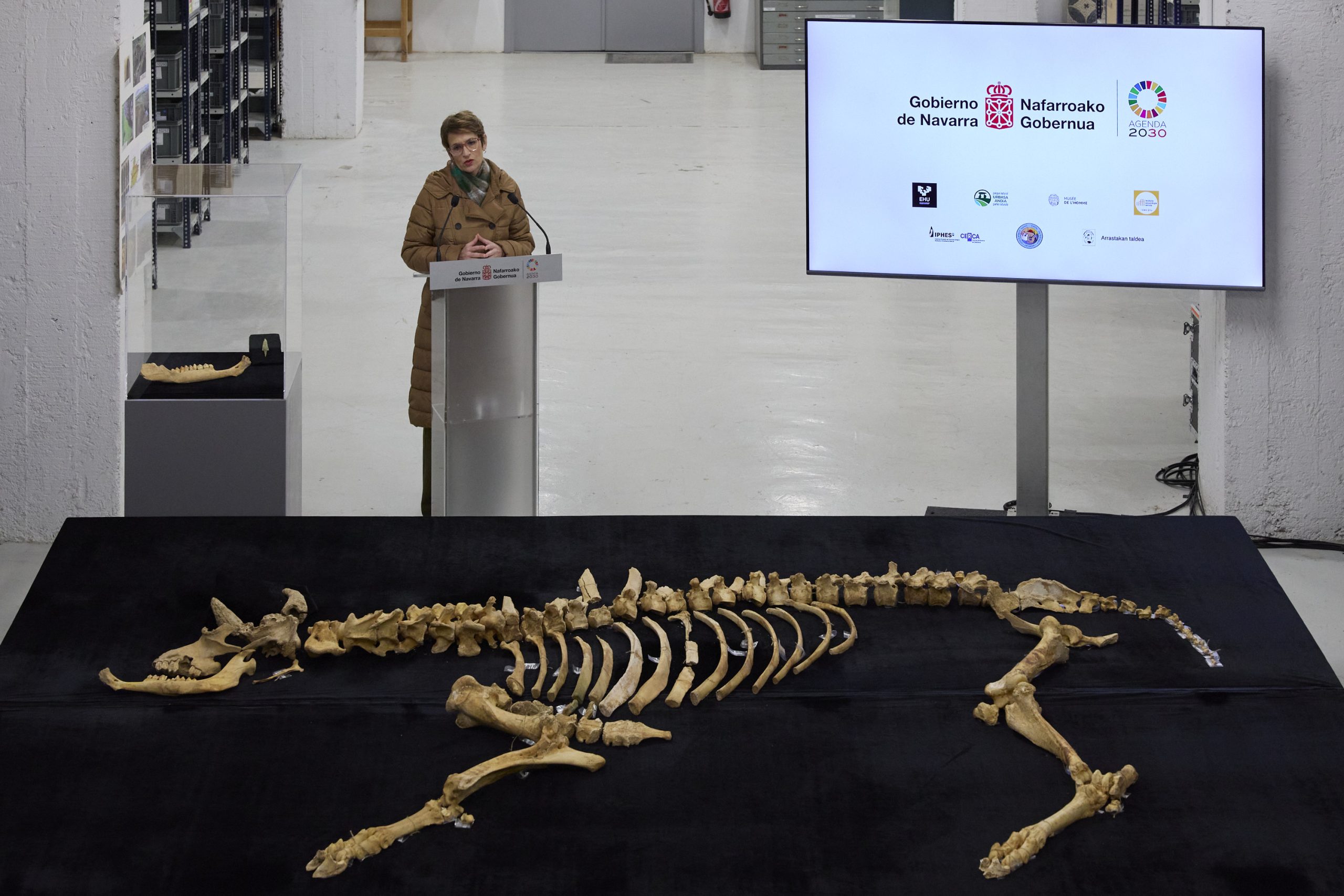 La presentación del hallazgo ha corrido a cargo de la presidenta de Navarra, María Chivite Navascués, y la consejera de Cultura, Deporte y Turismo, Rebeca Esnaola Bermejo, en los Fondos de Arqueología del Ejecutivo foral.