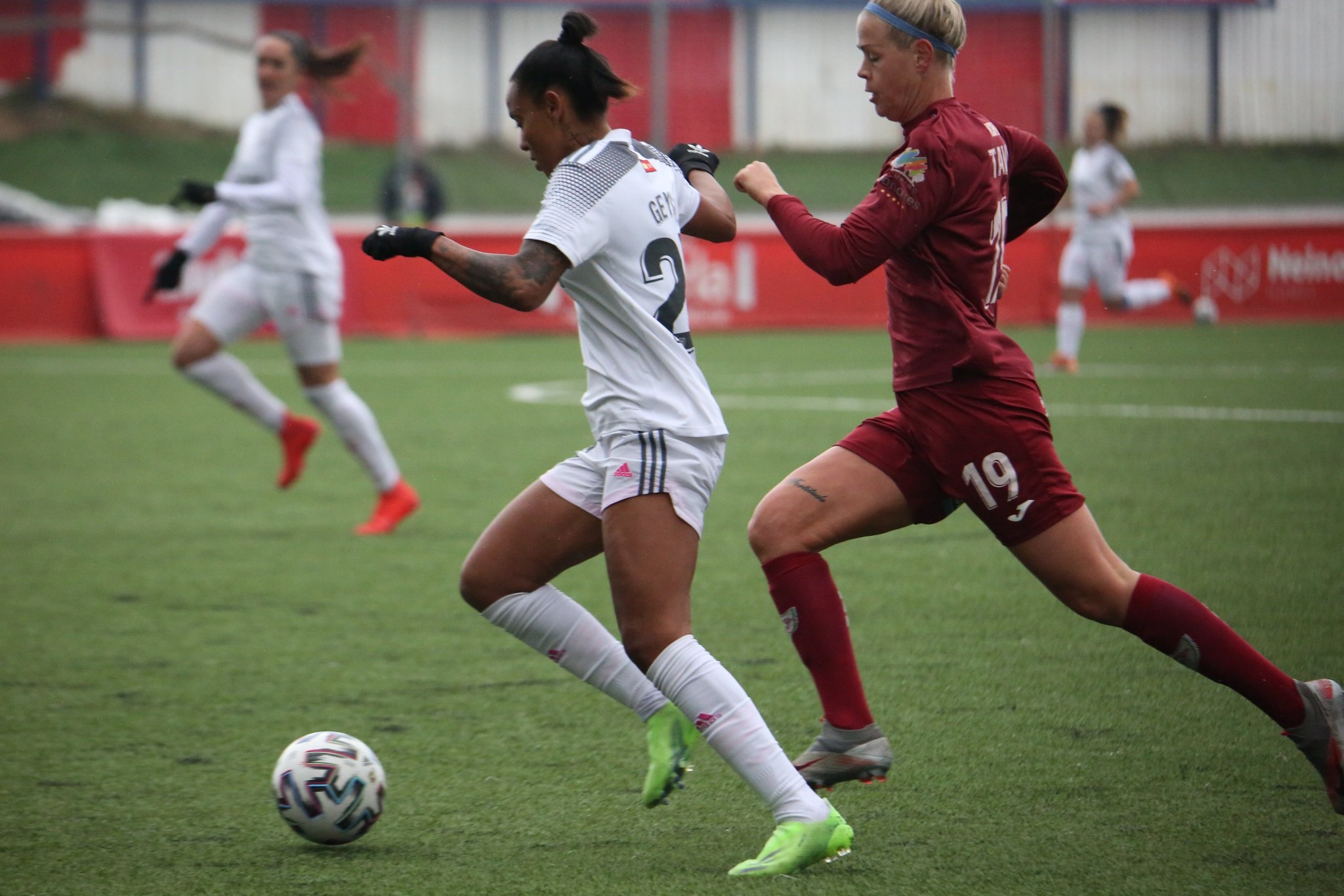 El comienzo del encuentro ya indicaría la tónica general de los 90 minutos, con un equipo madrileño tratando de imponer su ley sobre el césped de Matapiñonera. Geyse, en el minuto 11 dispondría de la primera oportunidad para las blancas, pero su disparo se iba desviado. Posteriormente, Rita, Estela y Maca confirmaban con claros acercamientos el buen estado de forma del Madrid CFF en el choque.