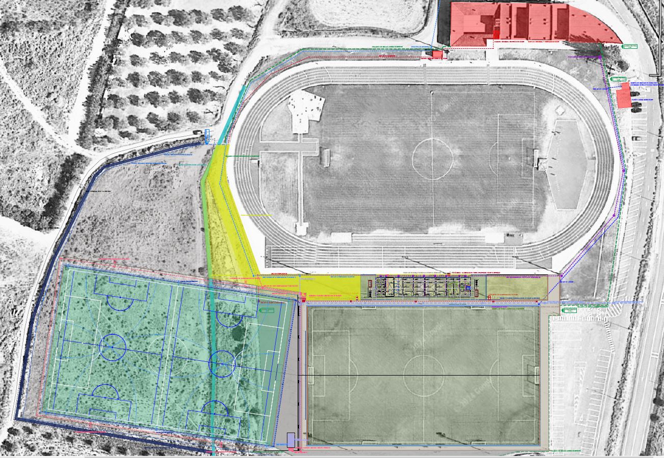 El proyecto se ejecutará en dos fases. En la primera, se construirá el campo de fútbol de césped artificial. En la segunda, se levantará un edificio de vestuarios con gradas para dar servicio al campo y a las pistas de atletismo.