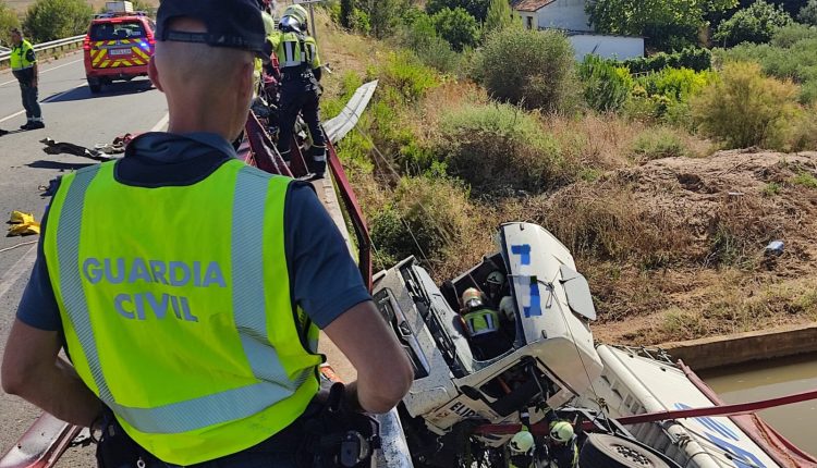 El siniestro ha consistido en la salida de vía de un camión articulado, que tras perder el control ha caído desde un puente al canal de Lodosa, quedando parcialmente el camión enganchado con hierros del puente y sin caer totalmente al agua.