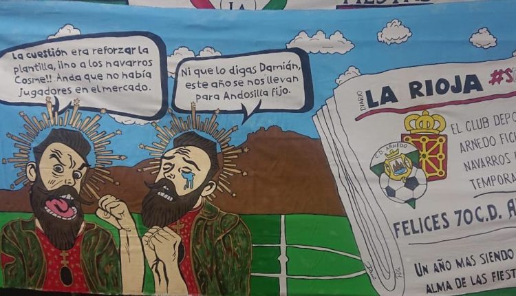¿La fórmula empleada? Llenar el equipo de muchos jugadores navarros y claro, este hecho ha llevado a empezar a hacer bromas y ‘coplas’ con este hecho. Por ello, la peña La Chispa celebrando este liderato de manos de los navarros y este setenta aniversario del club ha querido dedicar al CD Arnedo su pancarta de las próximas fiestas.