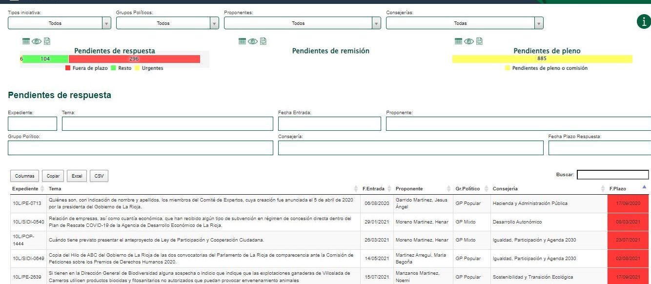 Ayer, 7 de diciembre, aparecían fuera de plazo 296 iniciativas pendientes de respuesta que ya están fuera de plazo frente a 104 iniciativas que aún están en plazo de respuesta. Además, otras seis están a punto de cumplir su plazo. Dicho de otra manera, el 73% de las iniciativas actualmente pendientes están ya fuera de plazo.