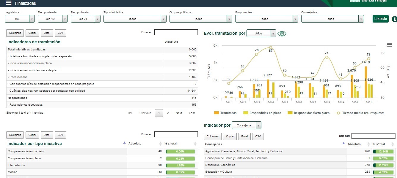 Salud y Desarrollo Autonómico con porcentajes que superan el 75% de respuestas fuera de plazo, le seguirían las Consejerías de Igualdad (54%) y Sostenibilidad (52%) en torno del 50% de las iniciativas satisfechas a los diputados una vez transcurrido el plazo para hacerlo, mientras que Educación se mantiene como la más cumplidora.